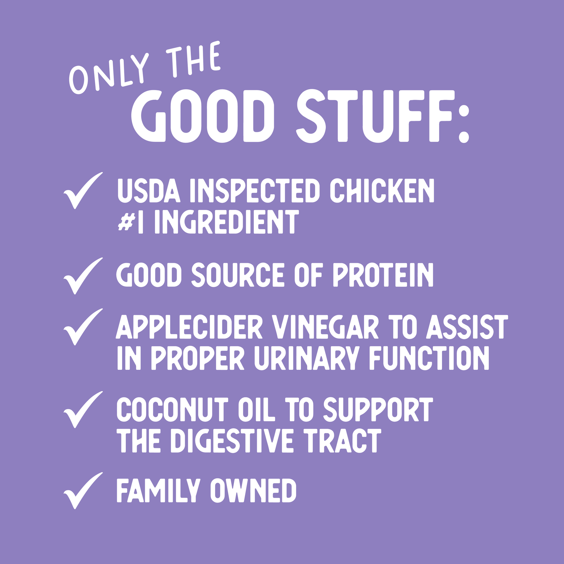 Chicken, Chicken Broth, Modified Tapioca Starch, Cellulose Fiber, Pea Protein, Tricalcium Phosphate, Potassium Chloride, Guar Gum, Salt, Coconut Oil, Apple Cider Vinegar Choline Chloride, Dextrose Anhydrous, Taurine, Zinc Proteinate, Iron Proteinate, Vitamin E Supplement, Thiamine Mononitrate, Manganese Proteinate, Niacin, Vitamin A Supplement, Sodium Selenite, Copper Proteinate, Calcium Iodate, Calcium Pantothenate, Riboflavin Supplement, Pyridoxine Hydrocholoride, Vitamin D Supplement, Vitamin B12 Supplement, Folic Acid, Biotin, Menadione Bisulfite Complex (Source of Vitamin K Activity)