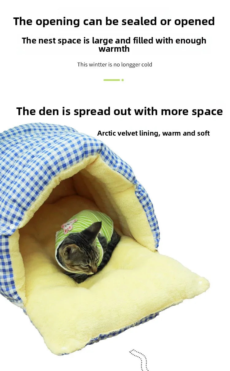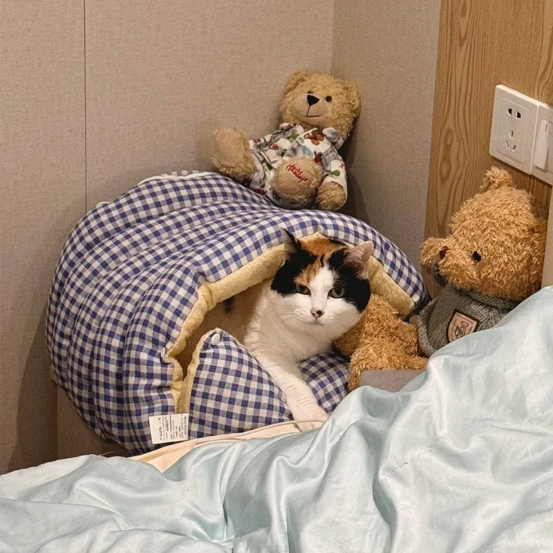 Winter Cat & Dog House – Closed Warm Plush Bed with Detachable Plaid Cover